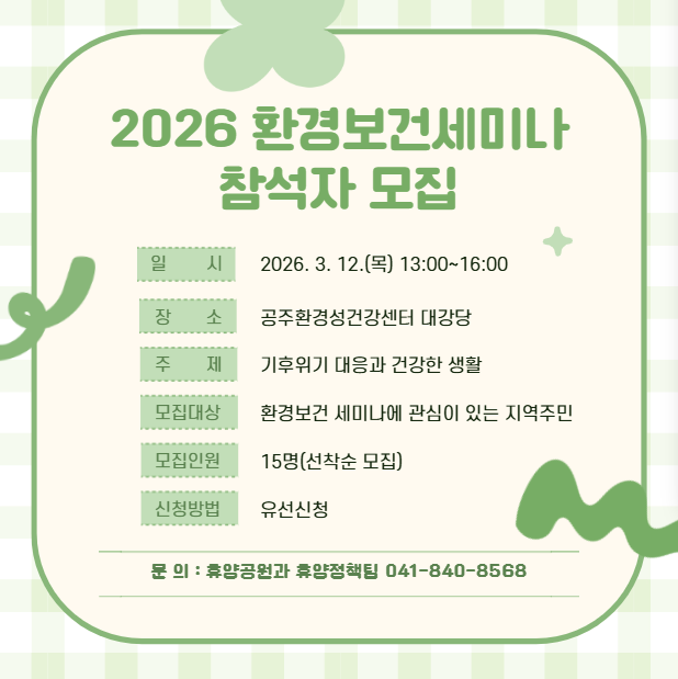 | 1944 | 2026 환경보건 공동세미나 개최 안내 | 웅진동 | 9 | 2026-03-08 | 2026 환경보건 공동세미나 참석자 모집.png |