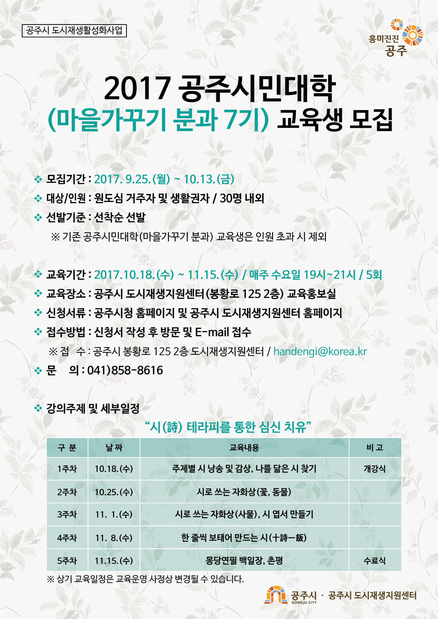 | 264 | 2017 공주시민대학(마을가꾸기 분과 7기) 교육생 모집 | 옥룡동 | 156 | 2017-09-25 | 마을가꾸기 7기.jpg |