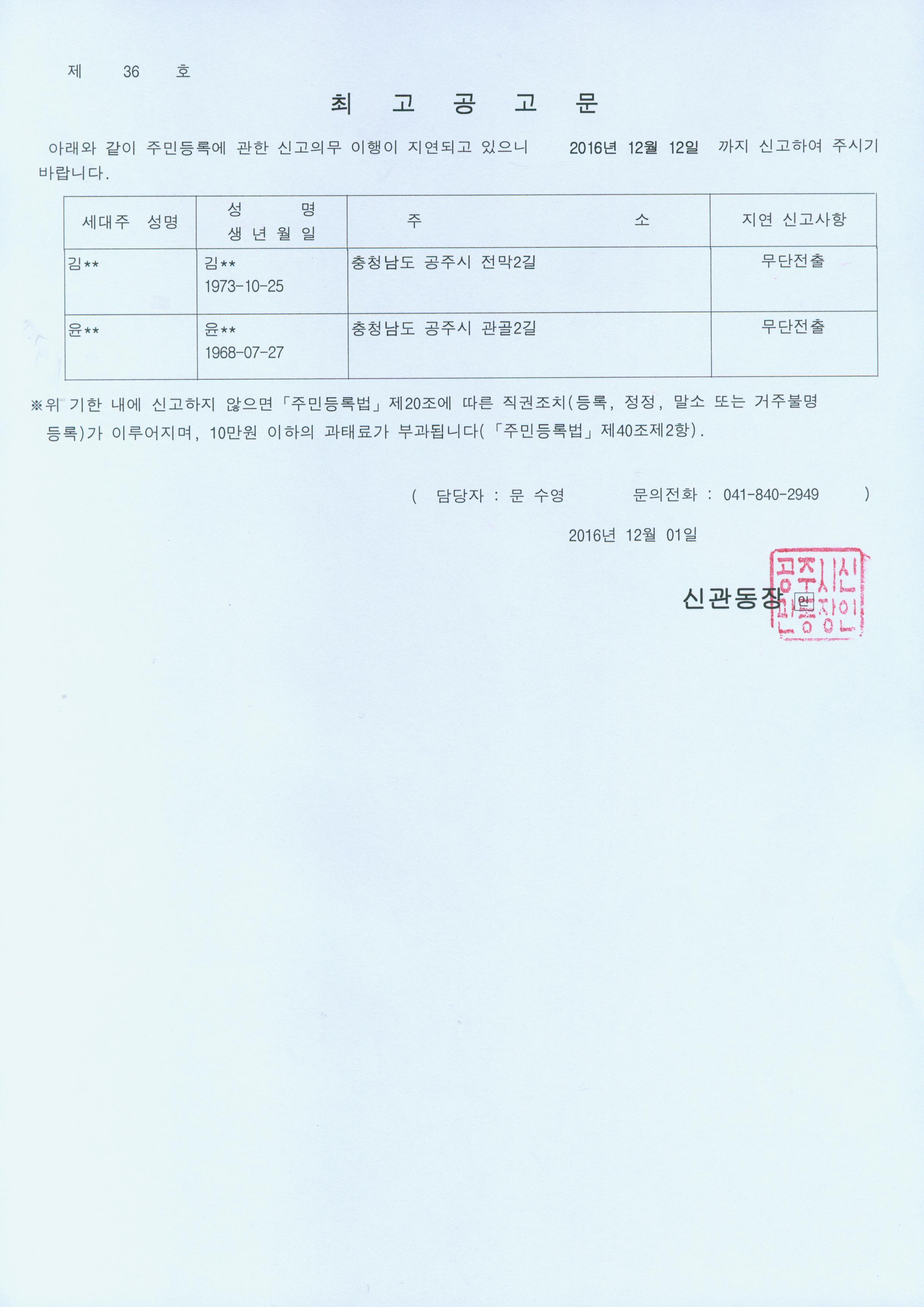| 300 | 주민등록 거주불명등록 최고공고 | 신관동 | 496 | 2016-12-02 | 공고문(제36호).jpg |
