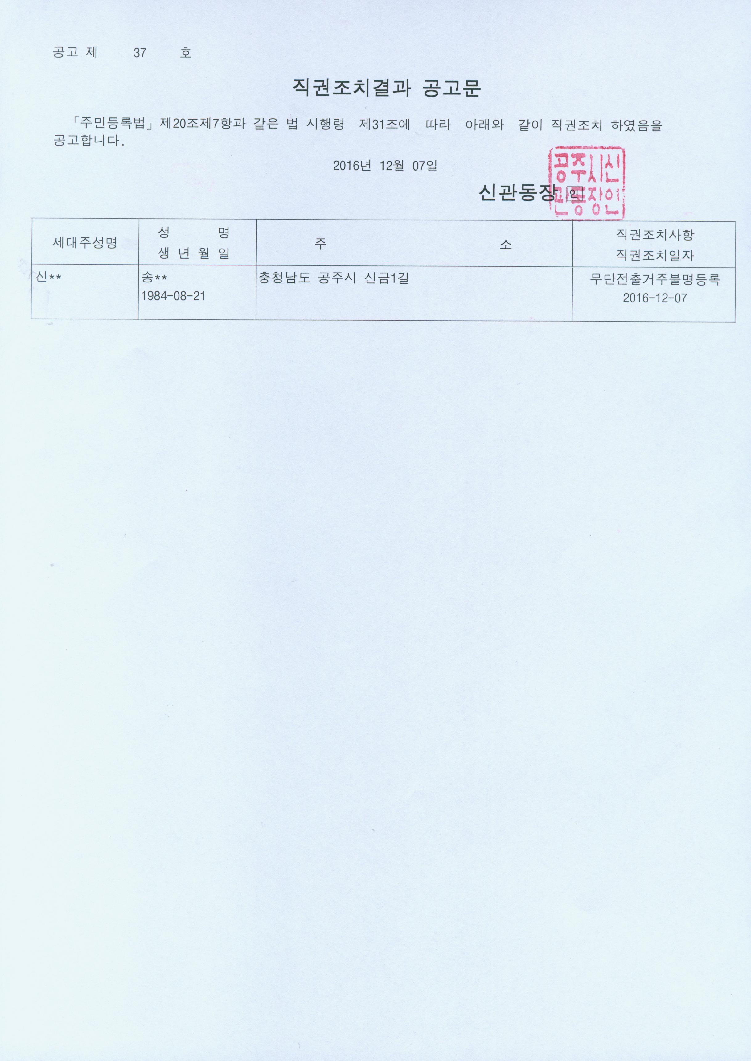 | 302 | 주민등록 거주불명등록 직권조치 결과 공고 | 신관동 | 550 | 2016-12-07 | 공고문(제37호).jpg |