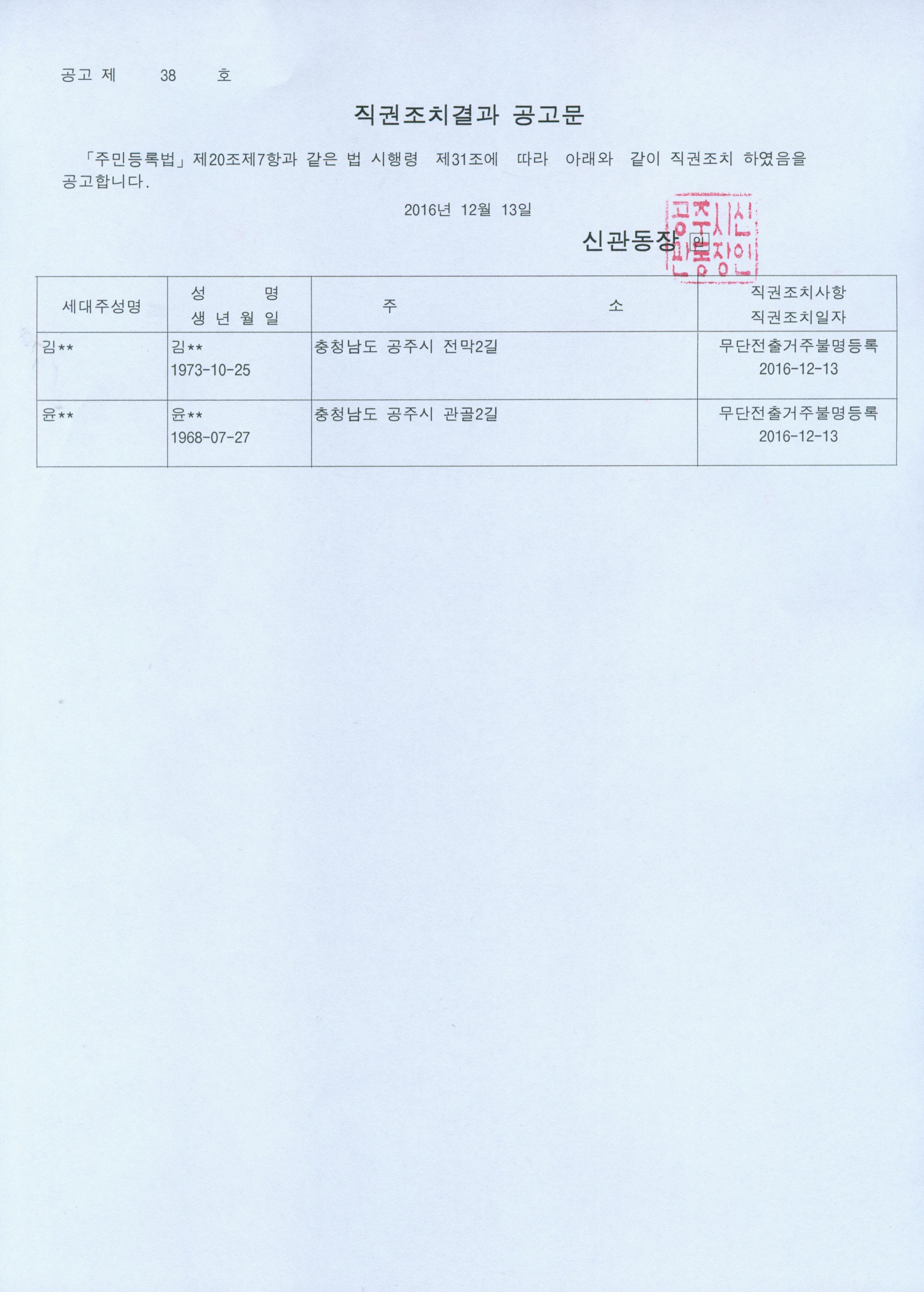 | 304 | 주민등록 거주불명등록 직권조치 결과 공고 | 신관동 | 718 | 2016-12-13 | 공고문(제38호).jpg |