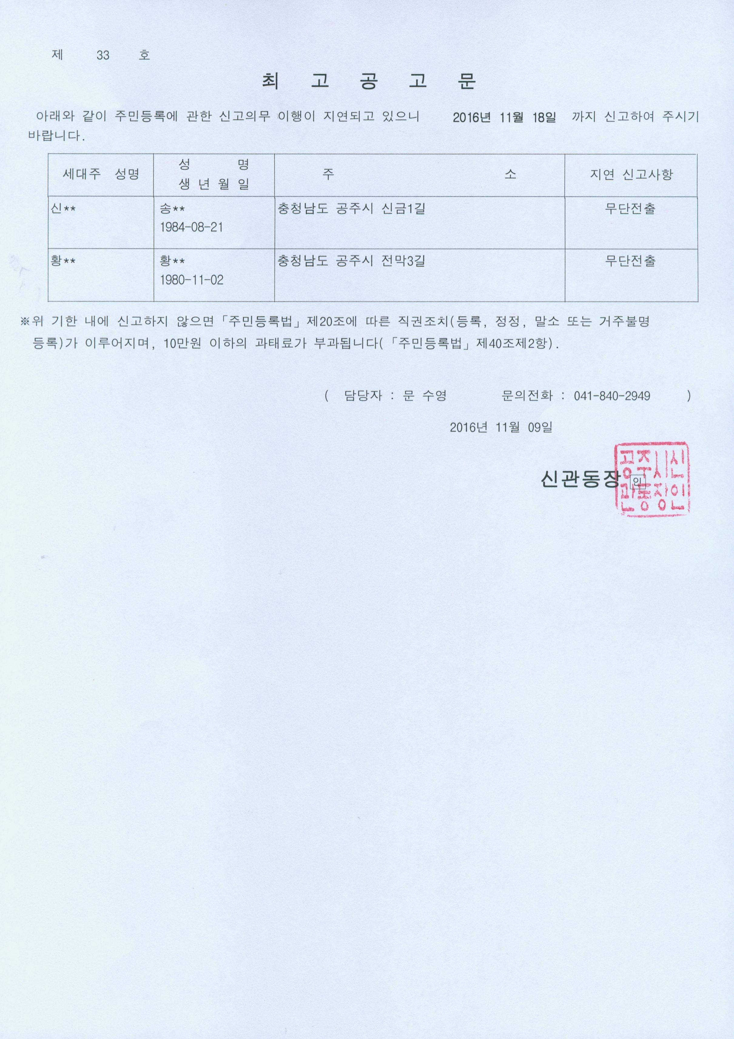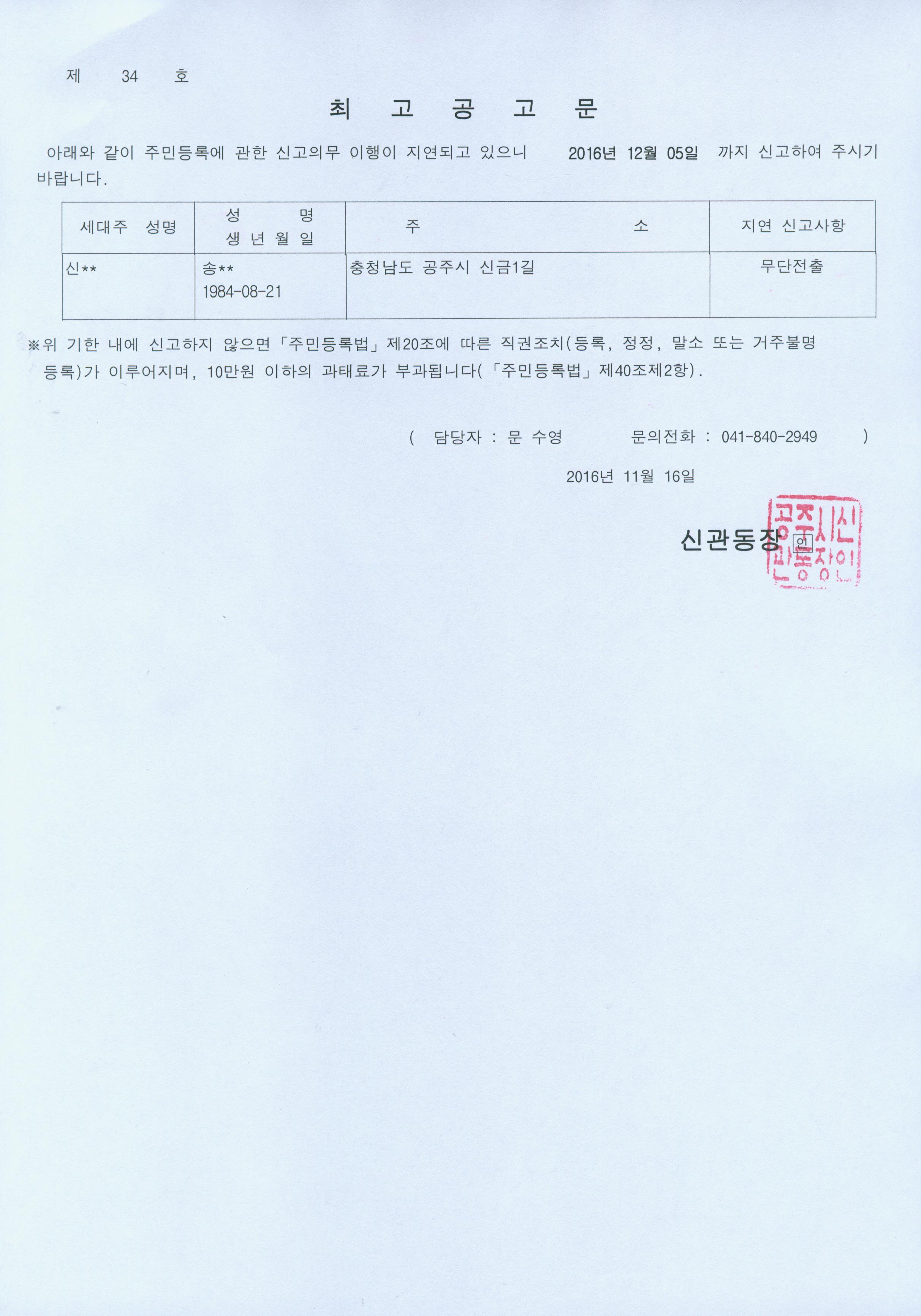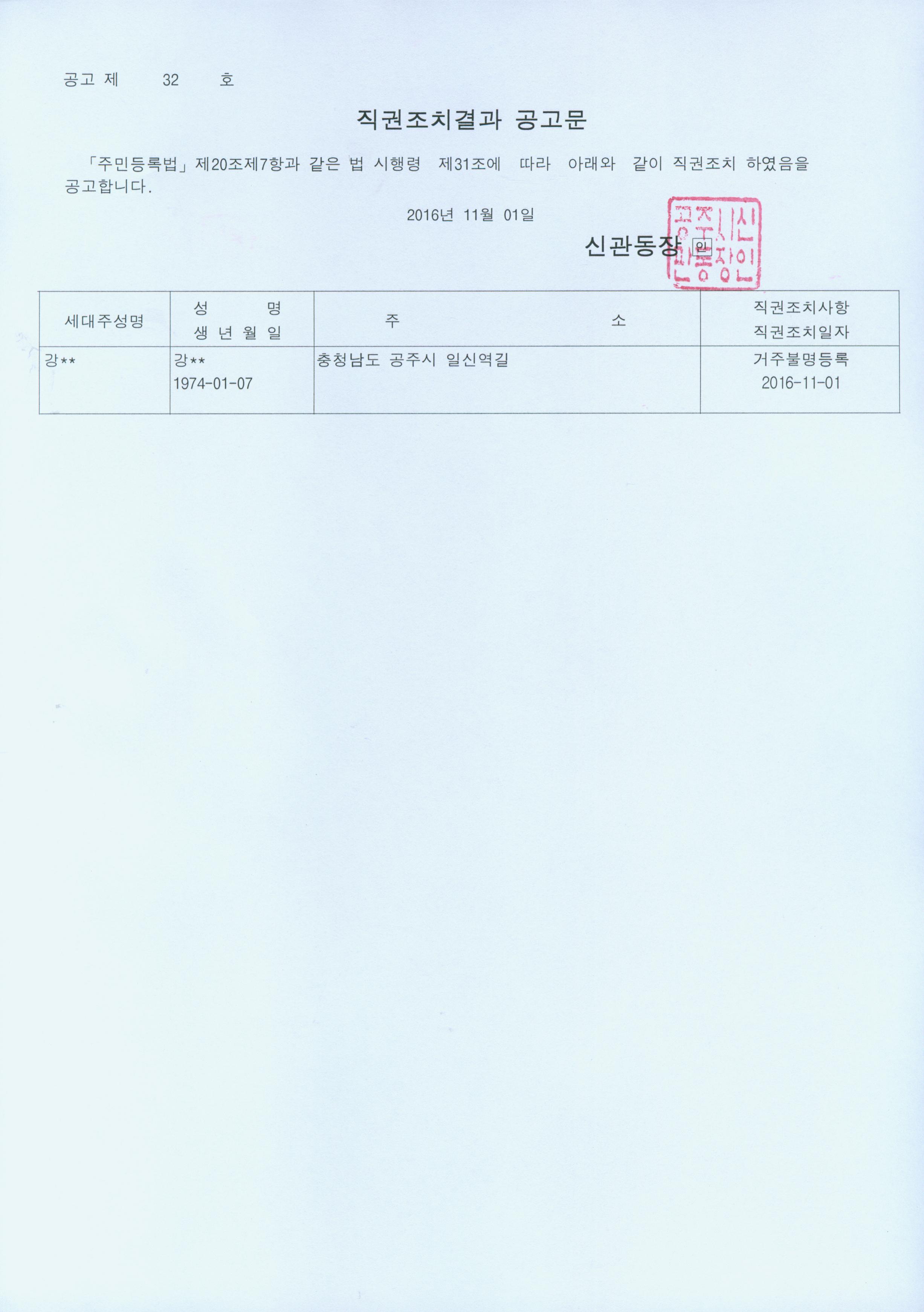 | 293 | 주민등록 거주불명등록자 행정상 관리주소 이전 직권조치 결과 공고 | 신관동 | 472 | 2016-11-01 | 공고문(제32호).jpg |