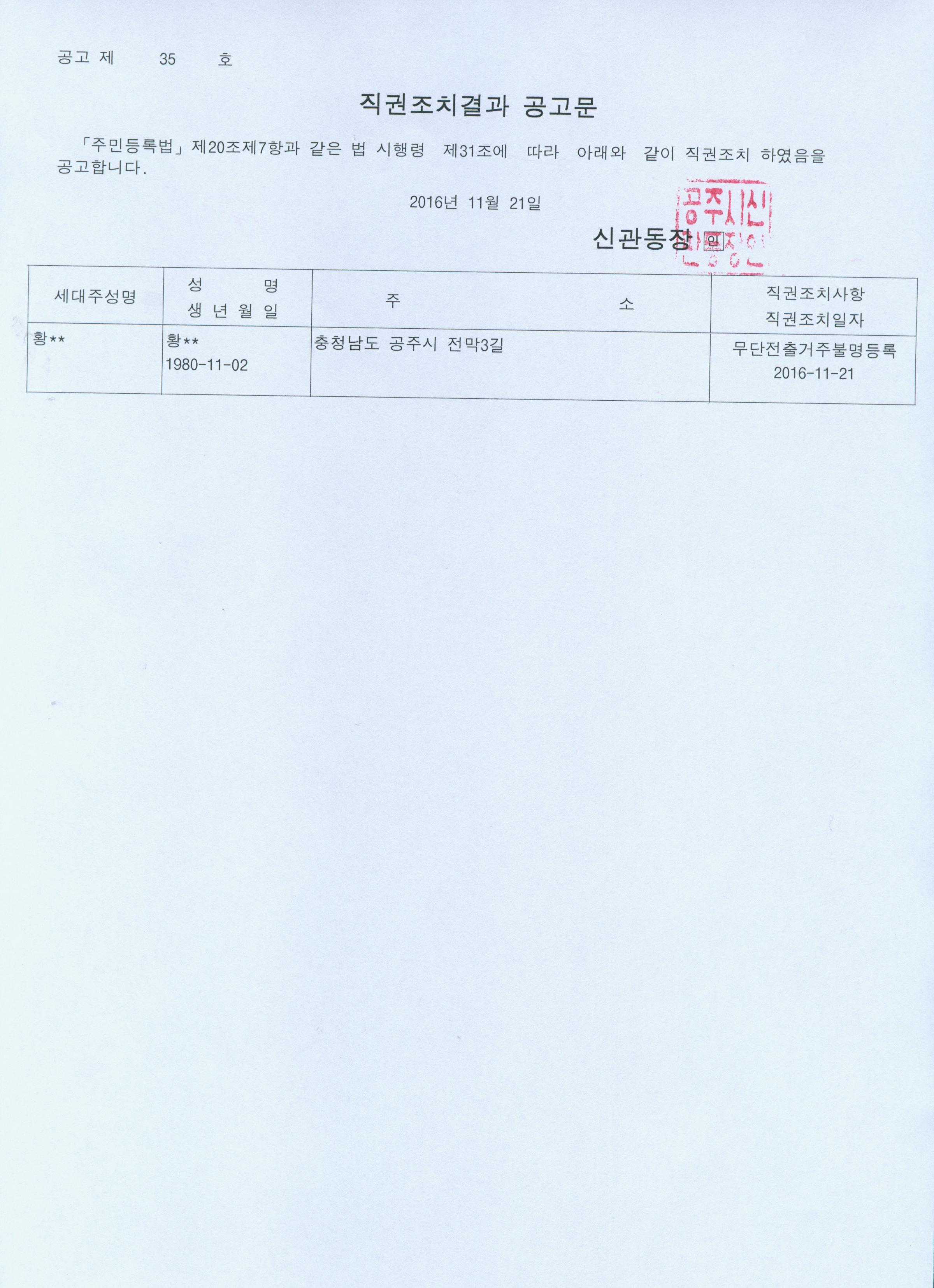 | 298 | 주민등록 거주불명등록 직권조치 결과 공고 | 신관동 | 507 | 2016-11-21 | 공고문(제35호).jpg |