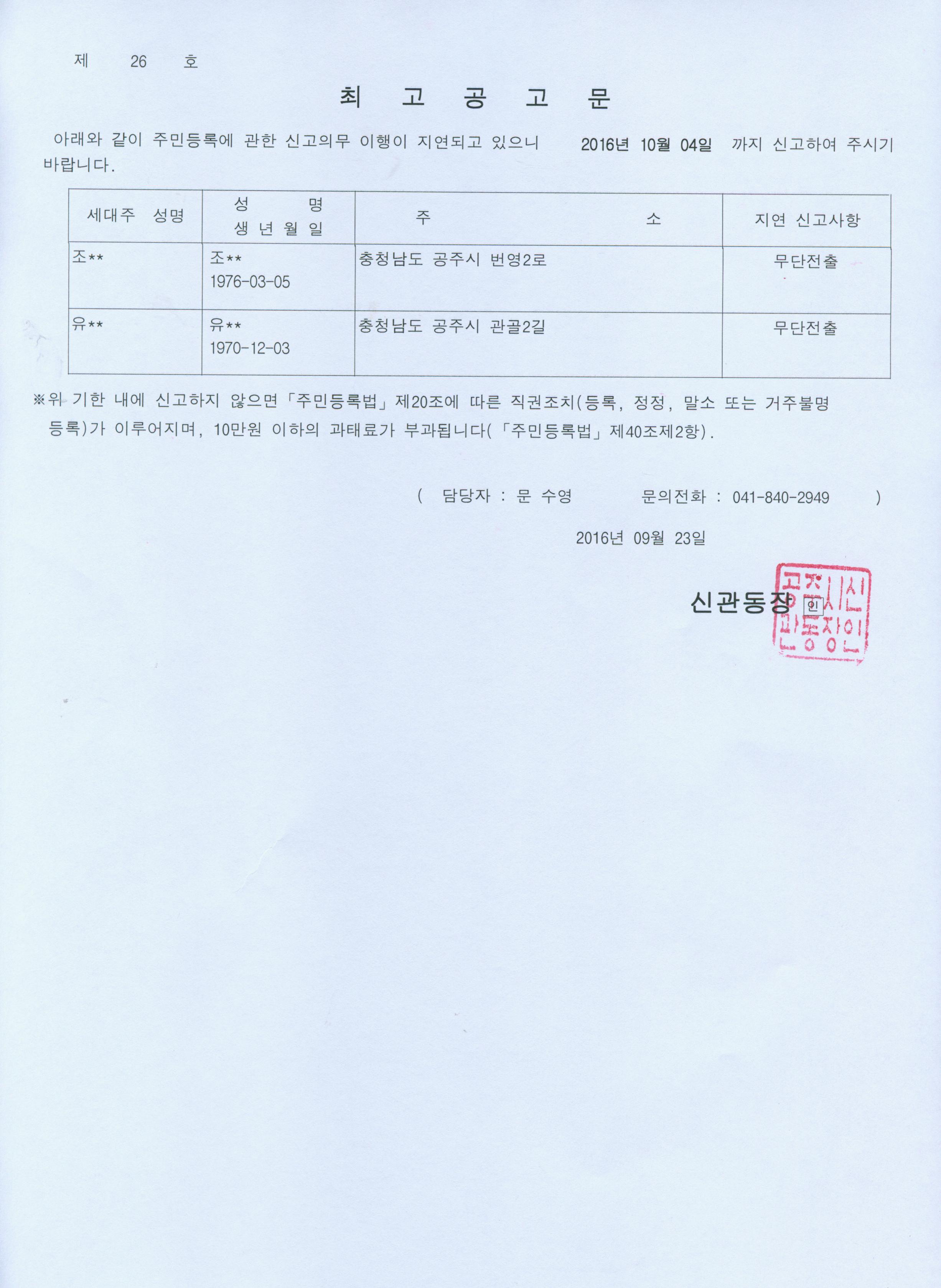 | 281 | 주민등록 거주불명등록 최고공고(조*수, 유*호) | 신관동 | 510 | 2016-09-23 | 공고문(제26호).jpg |