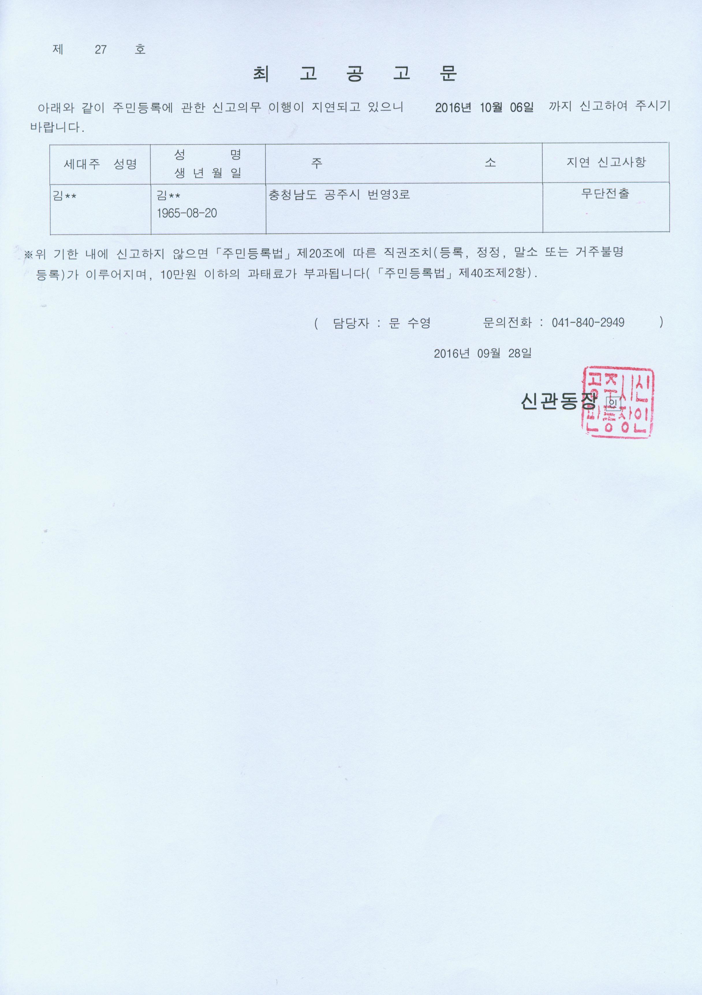 | 282 | 주민등록 거주불명등록 최고공고(김*안) | 신관동 | 489 | 2016-09-28 | 공고문(제27호).jpg |