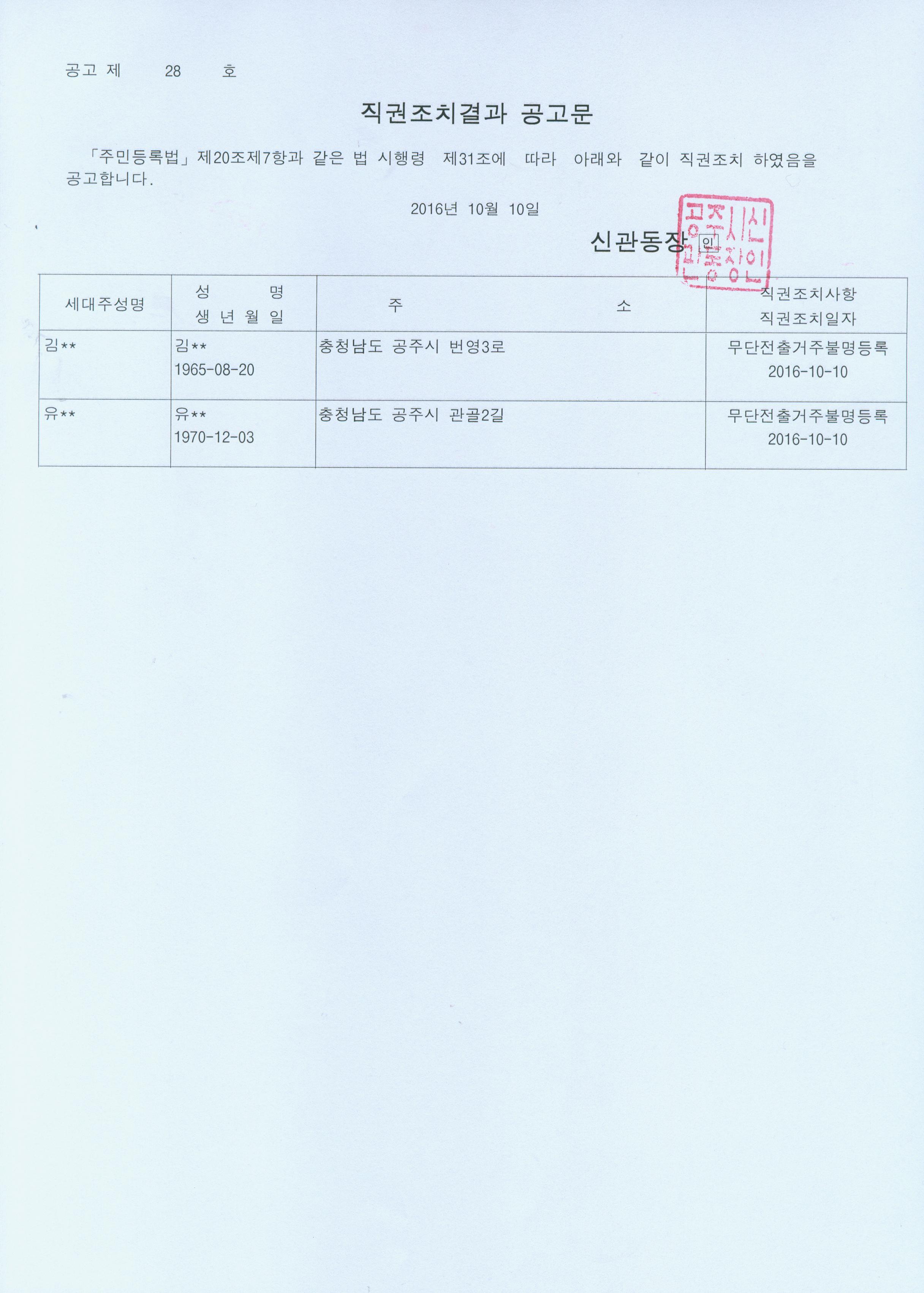 | 284 | 주민등록 거주불명등록 직권조치 결과 공고 | 신관동 | 443 | 2016-10-10 | 직권조치결과 공고문(제28호).jpg |