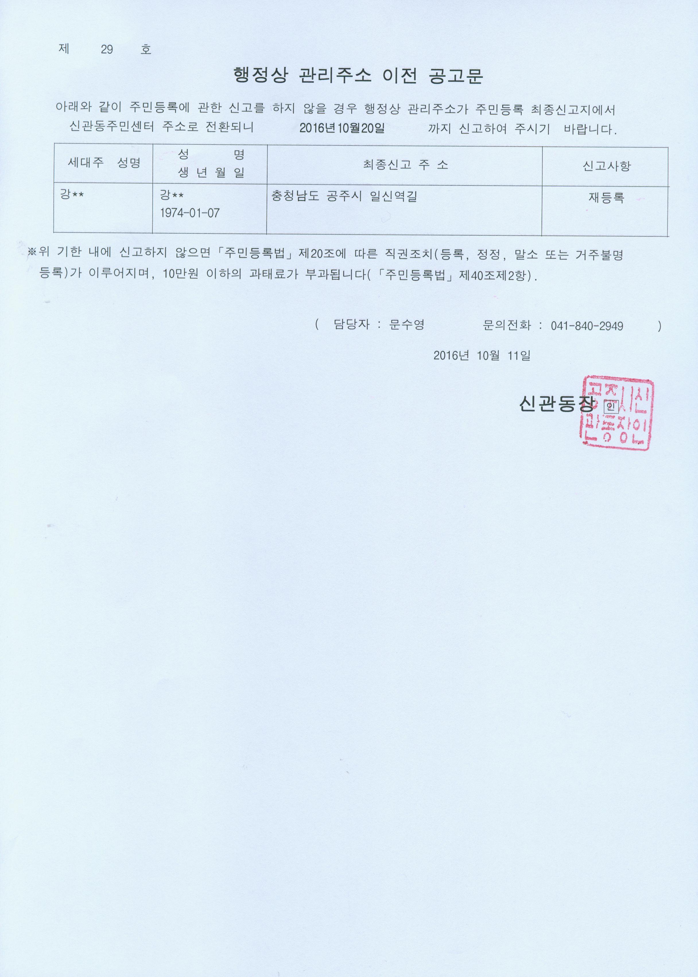 | 286 | 주민등록 거주불명등록자 행정상 관리주소 이전 공고(1차) | 신관동 | 487 | 2016-10-11 | 공고문(제29호).jpg |