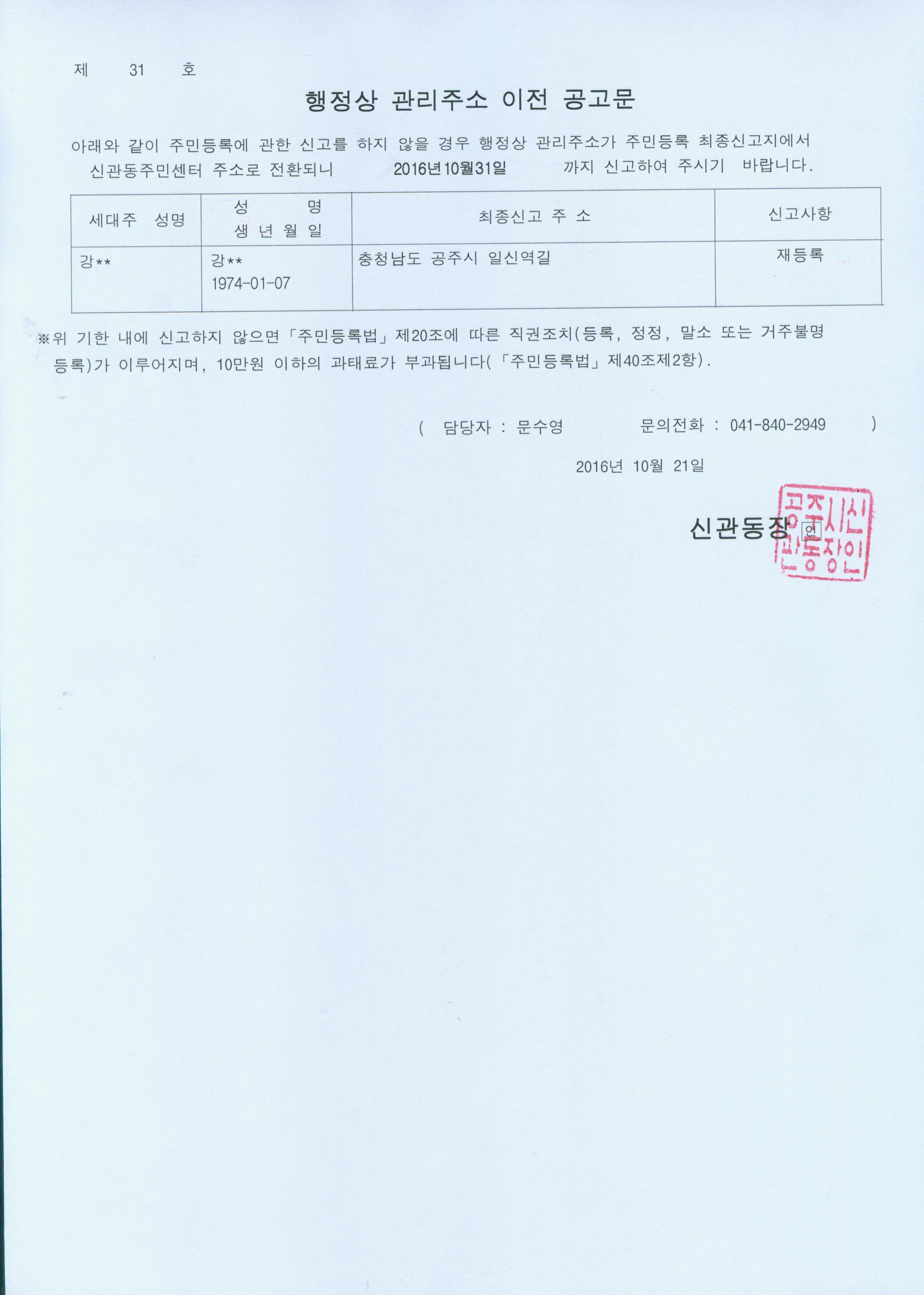 | 288 | 주민등록 거주불명등록자 행정상 관리주소 이전 공고(2차) | 신관동 | 618 | 2016-10-21 | 공고문(제31호).jpg |
