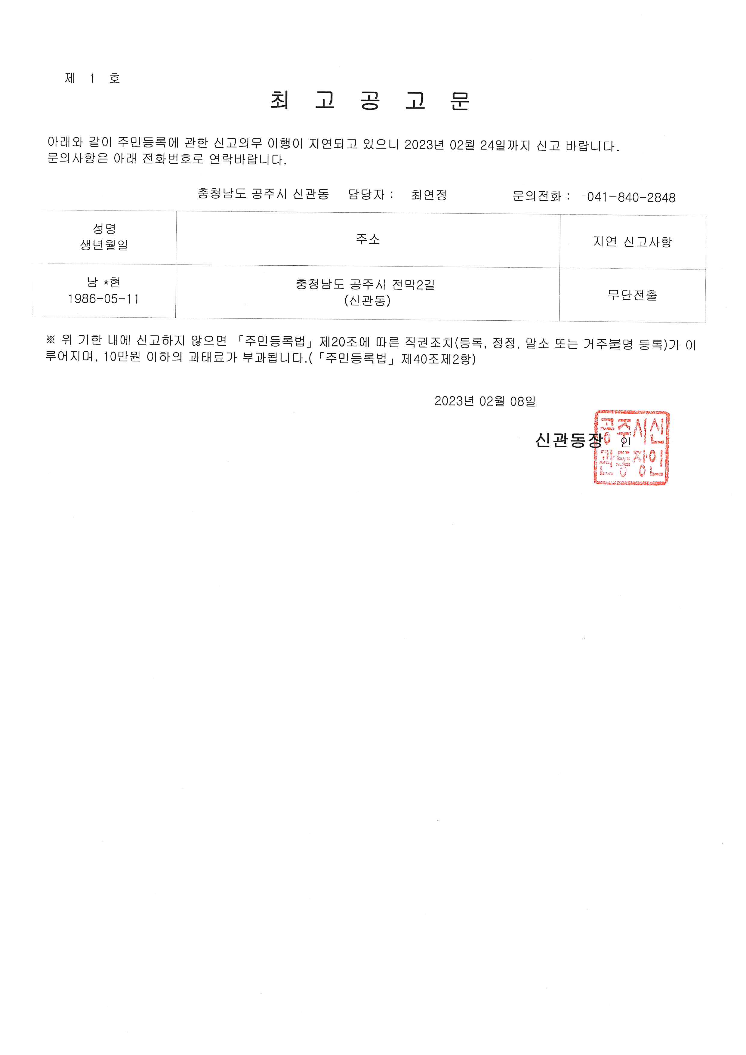 | 899 | 무단전출자에 대한 주민등록 거주불명 최고공고 | 신관동 | 48 | 2023-02-08 | 최고공고문 (남○현).jpg |