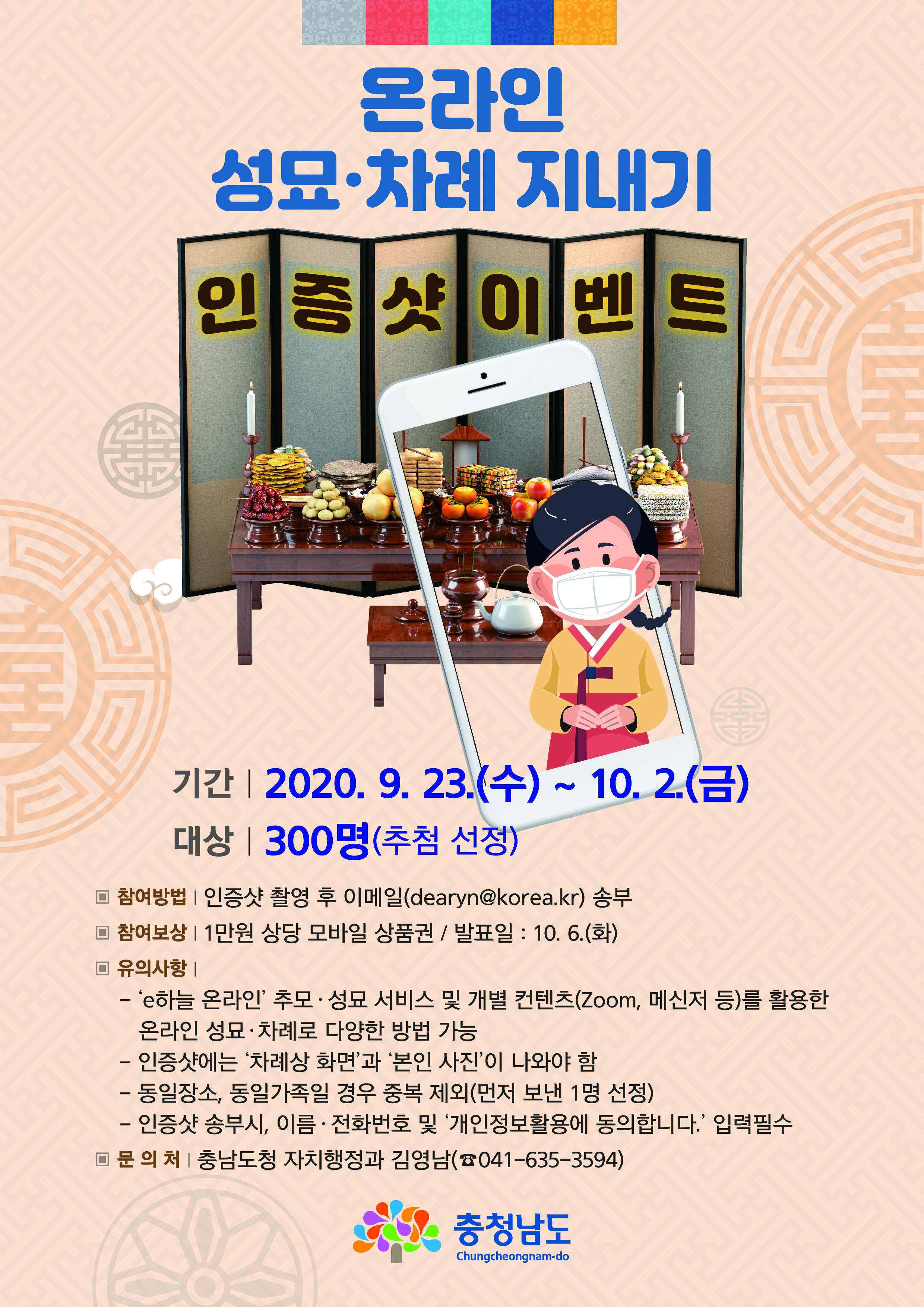 | 613 | 2020년 추석 온라인 성묘·차례 지내기 인증샷 이벤트 참여 협조 | 신관동 | 34 | 2020-09-25 | 온라인 성묘차례지내기 이벤트.jpg |