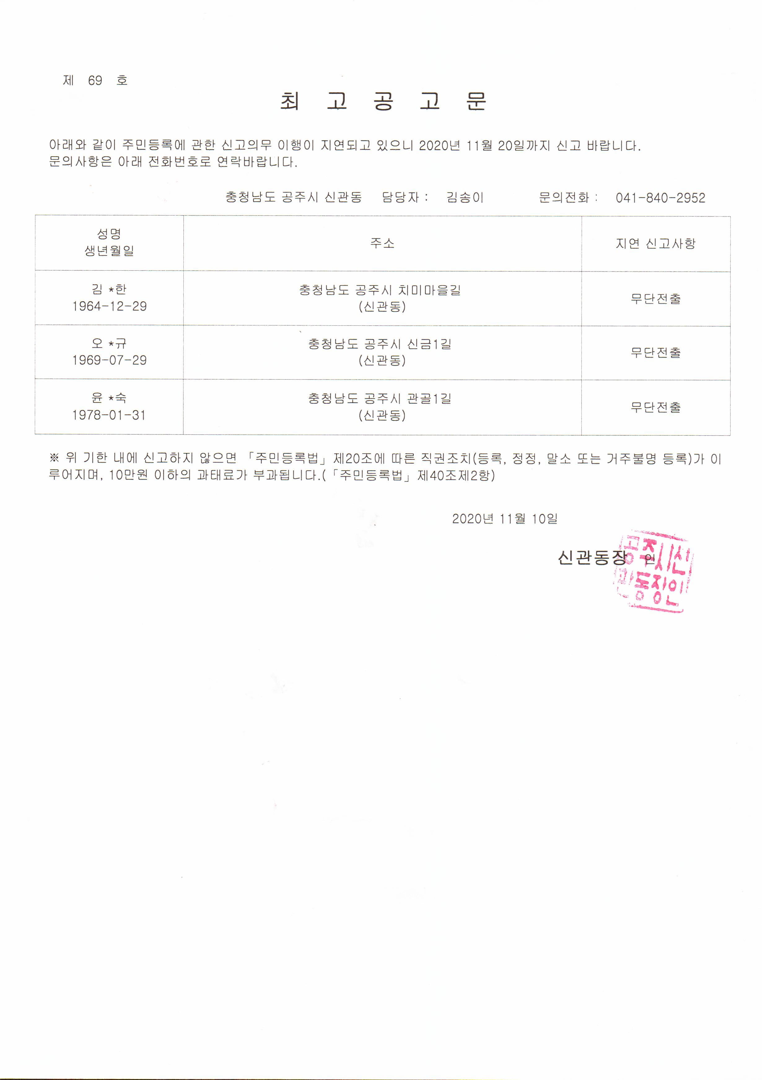 | 619 | 주민등록 거주불명 최고공고 | 신관동 | 27 | 2020-11-10 | 공고제69호.jpg |