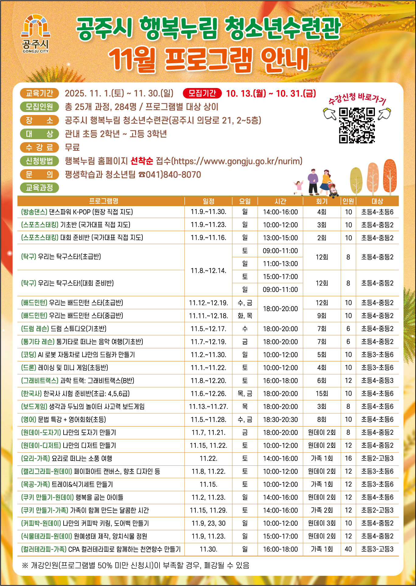 | 접수기간 | 2025-10-13 10:00 ~ 2025-11-07 18:00 | 지역 | 공주시전체 |