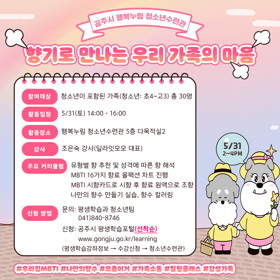 [프로그램 안내] *대상: 공주시 거주자 우선(타 지역민의 경우 인원 미달 시 신청 가능) *신청 연령: 초등학교 4학년 ~ 고등학교 3학년 ▣ 프로그램 신청 유의사항 - 프로그램 신청 시 연락처 확인(변경사항 등 발생 시 개별 연락) - 부모님이 자녀를 대신하여 신청하는 경우"기타 사항" 란에 자녀 인적정보 기재 요망 → ex) 신청인: 부, 모 - 홍길동 / 참가자: 부, 모 - 홍길동 / 자, 녀 - 김철수 - 반드시 신청 연령에 맞는 청소년이 포함된 "가족 단위"로 신청하여야 함 - 대기 중일 경우 취소자 발생 시 순차적으로 연락(연락을 받지 않으면 다음 대기자 연락) ※ 프로그램 진행 중 사진 / 영상 등 촬영한 사진은 결과 보고 및 홍보자료 작성 등에 활용됩니다. (원하지 않으시면 담당자에게 사전에 꼭 말씀 부탁드립니다!) ※ 수강신청자 50% 미만일 경우 폐강 할 수 있습니다. |